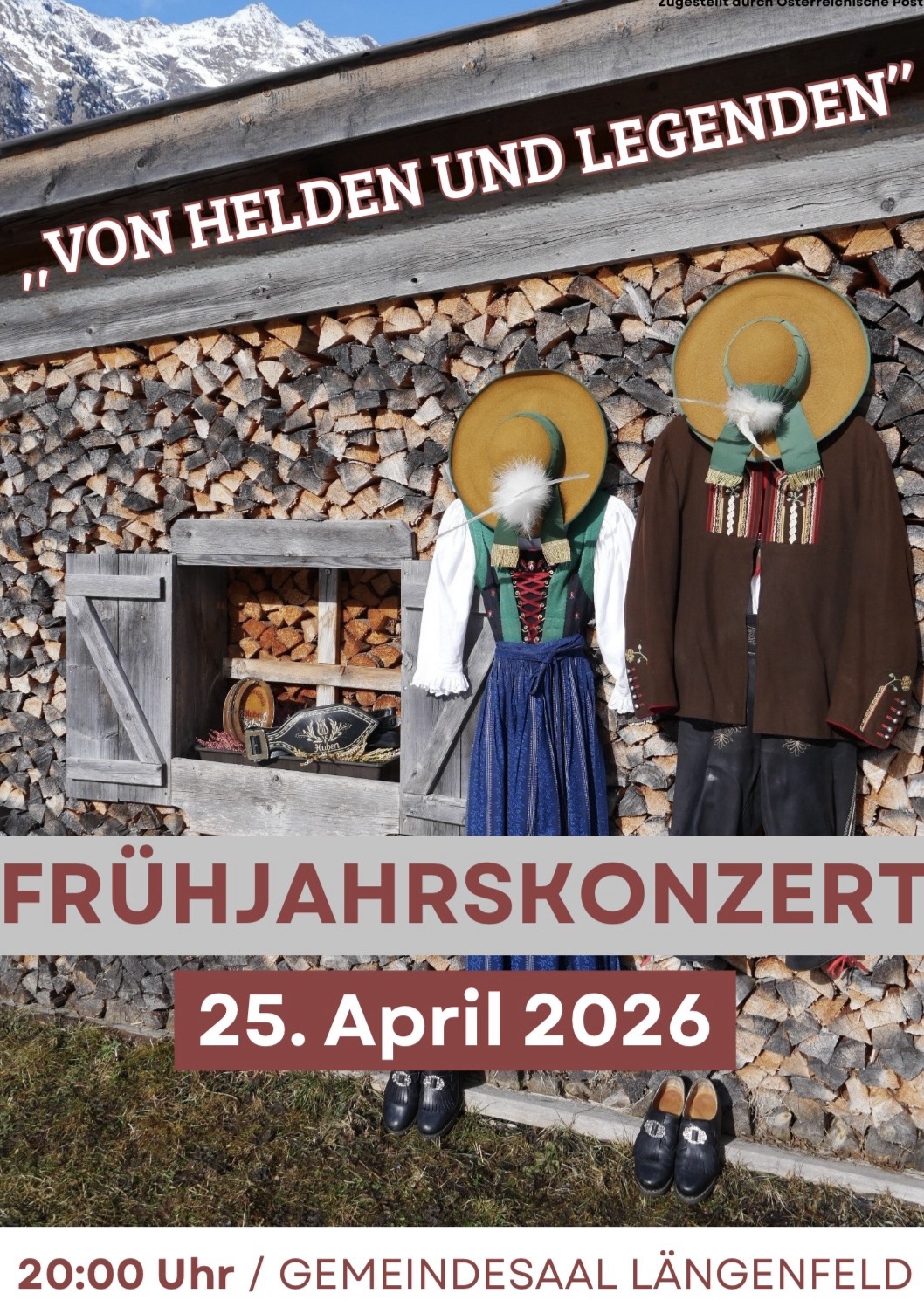 Am 25. April findet unser Frühjahrskonzert statt, welches unter dem Motto „Von Helden und Legenden“ steht. Die Musikkapelle Huben entführt euch beim diesjährigen Frühjahrskonzert in eindrucksvolle, musikalische Welten voller Mut, Emotion und Fantasie. Kraftvolle Märsche, eine klangprächtige Ouvertüre und mitreißende Filmmusik lassen Heldengeschichten lebendig werden und zeigen die ganze Vielfalt der Blasmusik. Seid dabei! Am 25. April um 20:00Uhr im Gemeindesaal in Längenfeld.