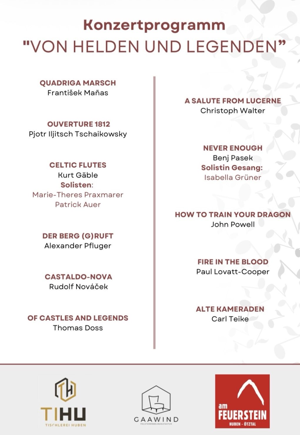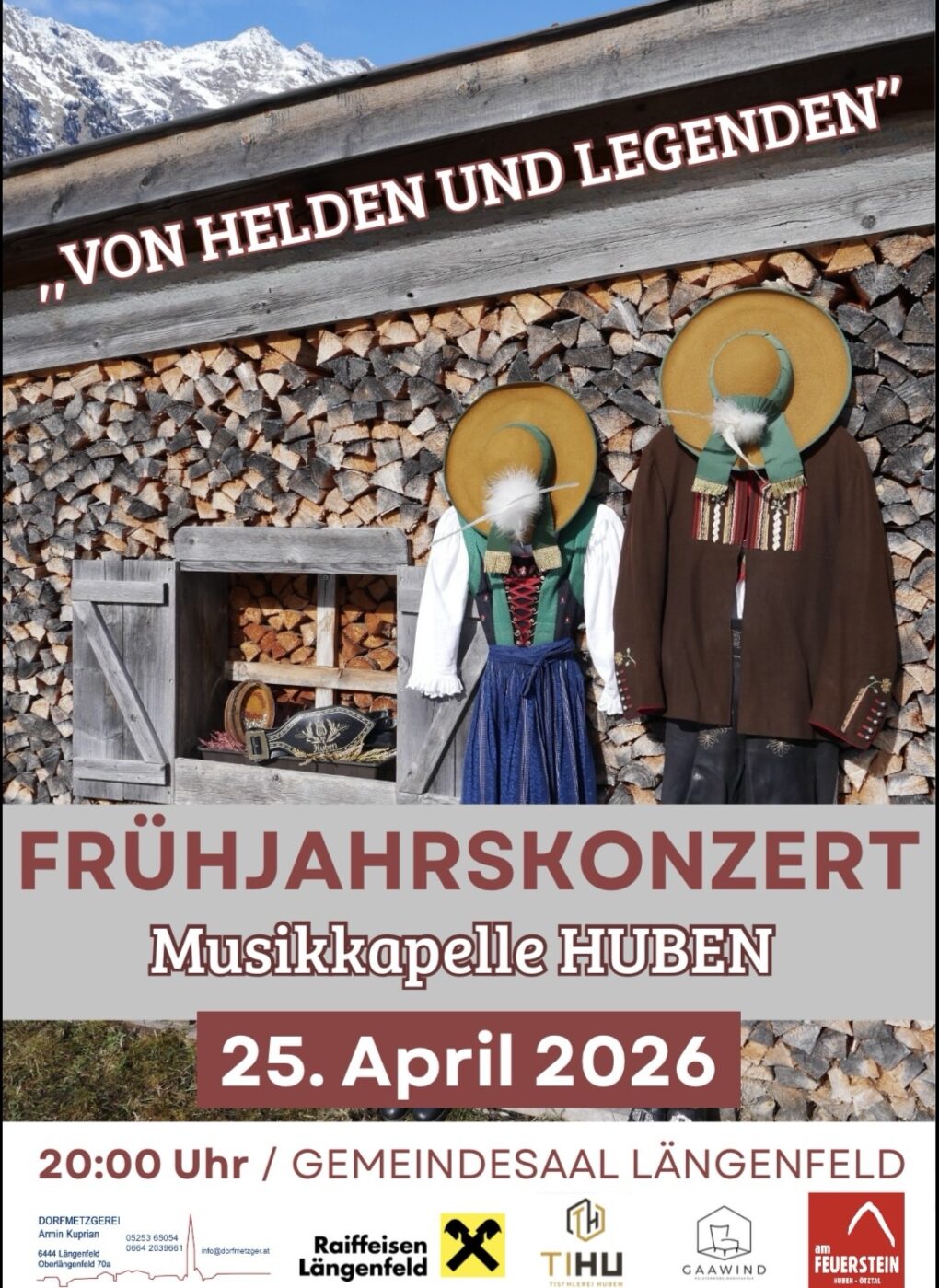 Die Musikkapelle Huben entführt euch beim diesjährigen Frühjahrskonzert in eindrucksvolle, musikalische Welten voller Mut, Emotion und Fantasie. Kraftvolle Märsche, eine klangprächtige Ouvertüre und mitreißende Filmmusik lassen Heldengeschichten lebendig werden und zeigen die ganze Vielfalt der Blasmusik.