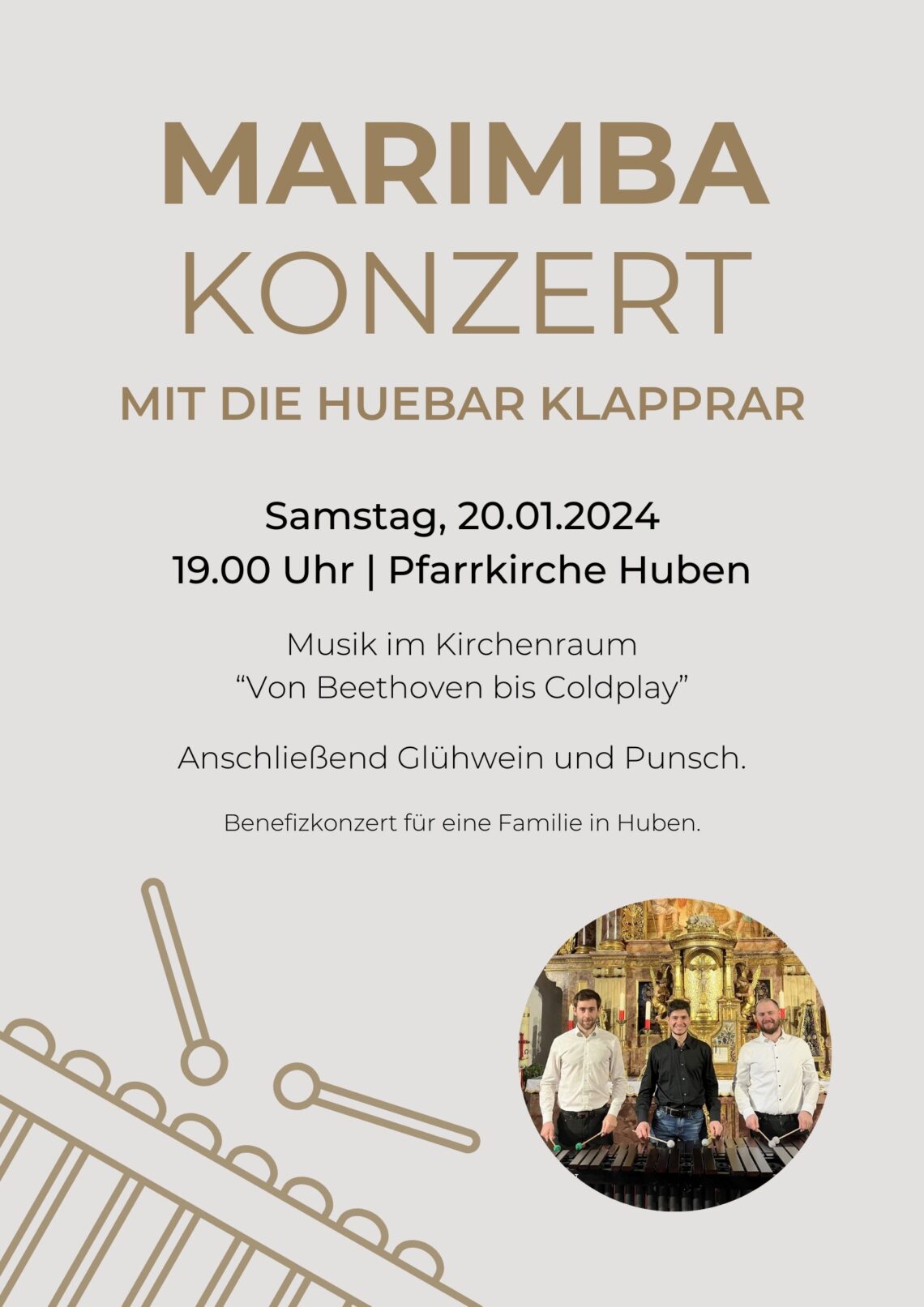 Konzert in der Pfarrkirche in Huben mit die „HuebarKlapprar“ – Johannes, René und Andrä. Mit Stücken von der Klassik bis ins 21. Jahrhundert, aber auch Klängen aus Afrika – dem Ursprung dieses besonderen Instrumentes. Ein spannendes, abwechslungsreiches Konzert für Ohren und Augen. Benefizkonzert für eine Familie in Huben – Eintritt freiwillige Spenden
