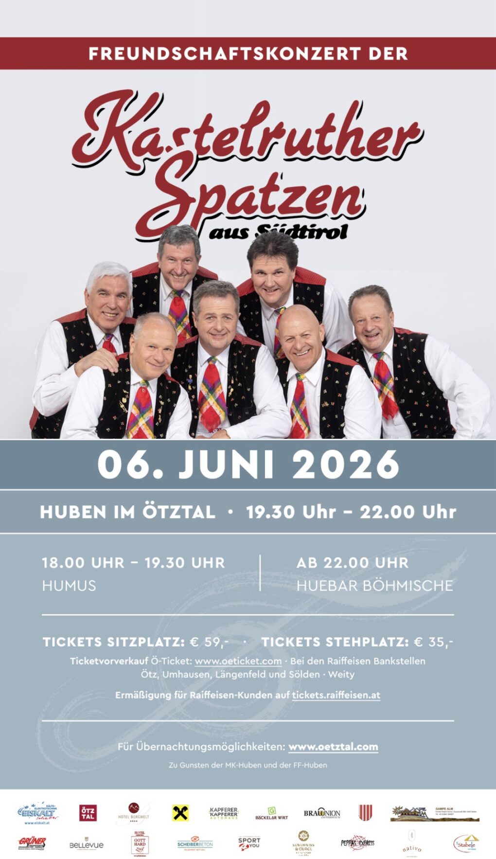 Ab heute gibt es Karten für das Kastelruther Spatzen Fest am 06.06.2026 in Huben. Erhältlich sind die Karten bei oeticket, den Raiffeisenbanken im Ötztal und bei Weity. Übernachtungsangebote findet ihr unter: